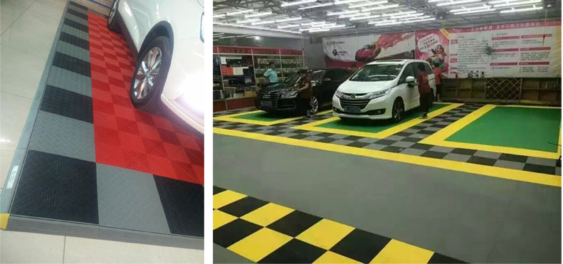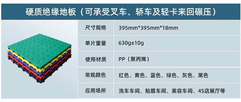 針對汽車快修車間、美容養護車間、汽車維修廠等區域,正和硬質絕緣地板成為地面升級的全新選擇。正和硬質絕緣地板下方密布數百個支撐點,完全可以承受車輛的來回碾壓,具有安裝快速簡便、對基礎要求寬泛、容易清理等特點 ,特別適用于車庫地面鋪設使用,也可作為產品展示的臨時展臺使用。 正和硬質絕緣地板采用100%純新PP材料生產而成,無毒、無味、環保,可回收利用,也可以用于健身房、辦公室等商用領域地面使用。