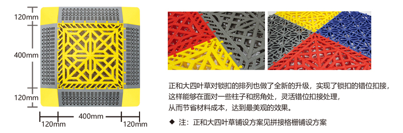正和大四葉草采用通扣設計,可以確保產品鋪設完成后在任何區域單獨取出,極大的方便了客戶后期局部清理泥沙等,給店面的日常衛生維護提供了很好的基礎。